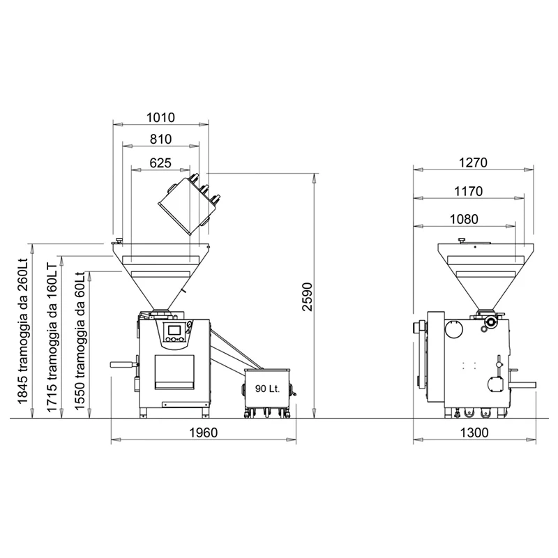 - Moega de 90 (disponível no F9), 160 ou 260 litros. No modelo com líder hidráulico uma plataforma vertical inter-bloqueada permite a inspeção e a limpeza da tremonha