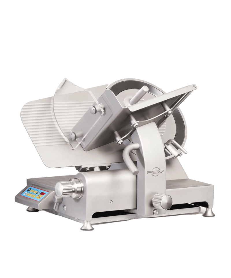 A máquina de fatiar de fiambre PXP-PSX350 SA é uma máquina automática, acionada por engrenagem, para cortar carne, queijo e outros produtos de charcutaria com um afiador independente.